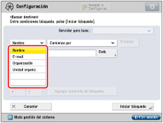 [Comienza por]: | El resultado debe empezar por las mismas letras que el nombre, la dirección de correo electrónico, la organización o la unidad de organización que se haya introducido. |