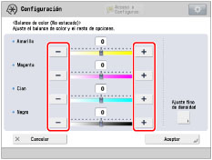 Pulse [-] o [+] para ajustar la intensidad de color de cada color.