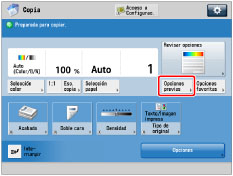 Los ajustes de copia se contabilizan como una sola configuración de copia reciente hasta estos momentos: Si no se han establecido como una única opción, no se pueden recuperar las opciones con [Opciones previas].
