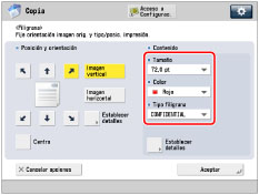El rendimiento de la impresión puede no ser óptimo dependiendo del contenido del original y de la combinación de opciones. Si usa [Filigrana] con [Agregar portada] o [Insertar hojas], los números no se imprimirán en las páginas insertadas. |