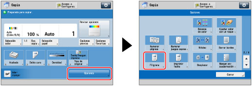 Este modo le permite imprimir filigranas en las copias que ha seleccionado. También puede añadir a la filigrana texto definido por el usuario.