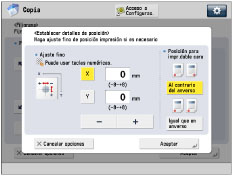 Para ajustar la posición de impresión, pulse [X] o [Y] → ajuste la posición de impresión con [-] o [+] → pulse [Aceptar].