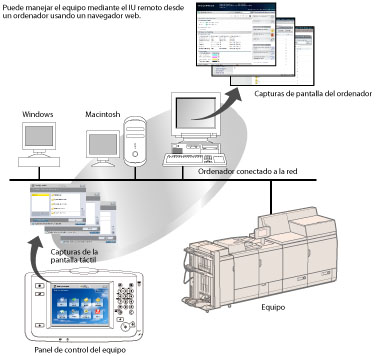 La IU (Interfaz del usuario) remota es un software preinstalado en el equipo que permite acceder a sus funciones mediante un navegador web. Por ejemplo, la IU remota permite acceder al equipo para comprobar el estado de los trabajos, ejecutar trabajos y especificar diversas opciones de configuración. Para usar la IU remota, tan solo necesita un navegador web y una conexión de red entre el ordenador y el equipo.