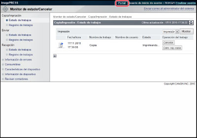 Para volver a la parte superior de la página, haga clic en [Portal]. Se muestra información, como el estado del equipo o el nombre del producto.