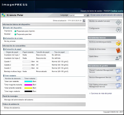 La IU remota le permite acceder al equipo a través de una red para visualizar su estado actual y su configuración, así como el estado de todo el procesamiento de la información y de los trabajos. El equipo se puede gestionar desde un ordenador conectado a la red sin tener que realizar operaciones en el propio equipo. Si especifica la dirección IP de imagePRESS Server en el navegador web, la página de inicio o la pantalla principal de la IU remota aparece en la pantalla del ordenador, como se muestra a continuación: