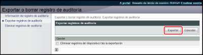 Haga clic en [Exportar] en <Exportar registros de auditoría>.