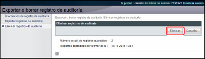 Haga clic en [Eliminar] en <Eliminar registros de auditoría>.