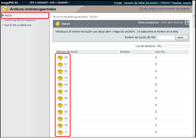 Haga clic en [Archivos recibidos/guardados] → seleccione [Buzón] → haga clic en el número del buzón deseado.