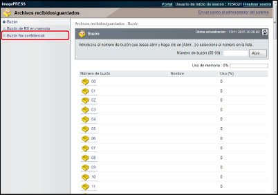 Haga clic en [Archivos recibidos/guardados] → [Buzón fax confidencial] → haga clic en el número del buzón deseado.