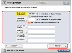 [Información de contacto]: | Pulse [Información de contacto] → introduzca la información de contacto para el administrador del sistema → pulse [Aceptar]. |