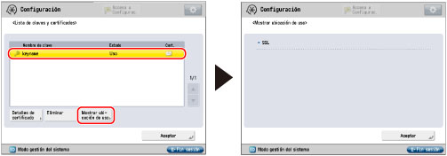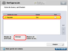 Los pares de claves para los que aparezca 'Uso' en <Estado> no pueden eliminarse porque están en uso con la autenticación /IPSec IEEE802.1X o porque está activado SSL. Pulse [Mostrar ubi- cación de uso] para comprobar el tipo de seguridad para el cual se usa el par de claves. Para eliminar un par de claves que sólo se utilice con SSL, desactive las siguientes opciones. Los pares de claves que se utilicen para la autenticación /IPSec IEEE802.1X no se pueden eliminar. <Usar SSL> en [IU remota] (Para más información, consulte los manuales suministrados con el imagePRESS Server). <RX SMTP> en [Opciones de e-mail/I-fax] (Consulte "Opciones de E-Mail/I-Fax".) [Restringir recepc. para cada función] en [Opciones distribución información dispositivo](Consulte "Guardar/borrar/imprimir destinos de entrega".) |