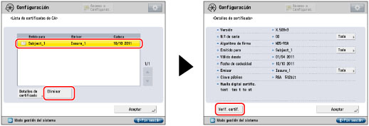 Seleccione el par de claves para el certificado de CA que desee confirmar → pulse [Detalles de certificado] → [Verif. certif.].
