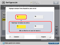 Pulse [Agregar siempre firma dispositivo para envío] → [Sí] para <Agregar siempre firma dispositivo para envío> → especifique la opción para <Restringir formatos de archivo>.