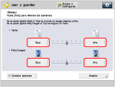 Para leer claramente texto y líneas, el ajuste deberá ser hacia [Alta] para <Texto>. Para leer originales que contengan fotografías impresas u otros tonos medios, el ajuste deberá ser hacia [Baja] para <Foto/imagen>.