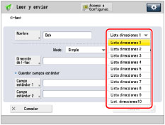 El primer carácter que introduzca para el nombre se utiliza para ordenar la lista de destino cuando se pulsan teclas, como [ABC], [DEF] y [GHI] en la pantalla Libreta de direcciones. Si se pulsa [Buscar por nombre] en la pantalla Libreta de direcciones, aparece una pantalla para limitar la búsqueda en la libreta de direcciones. |