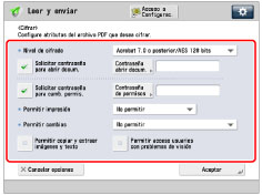 Este modo sólo puede utilizarse si se ha especificado una dirección de e-mail o un servidor de archivos como destino. Si especifica una dirección de I-fax o un buzón como destino, no podrá enviar el trabajo como un archivo PDF cifrado. |