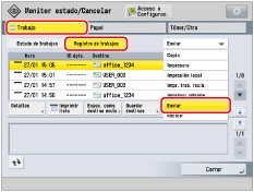 [Guardar destinos]* | Guarda el trabajo seleccionado como el destino. Seleccione [Libreta de direcciones] o [Acceso rápido] para mostrar la pantalla Configuración. (Consulte "Guardar destinos" o "Guardar las teclas de acceso rápido".) Si [PIN de libreta de direcciones] está establecido en [Establecer destino] (Configuración), aparecerá una pantalla solicitándole la introducción de la contraseña. (Consulte "Establecer la libreta de direcciones".) |