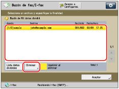 Si borra los datos divididos, no se pueden combinar para formar un archivo completo aunque se reciba posteriormente el resto de datos divididos. Dado que los datos divididos no son datos de imagen válidos, no se imprimirán correctamente. Si se eliminan los datos divididos mientras se están configurando opciones de reenvío o el modo Bloqueo de memoria para los datos, todos los procesos relacionados con la impresión obligatoria de la imagen se cancelan. |