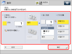 最多可以插入总计100张插页(或章节页)和标签纸。 如果使用已有印刷内容(如公司徽标)的纸张作为插页,则必须选择 [保留空白]。否则,本机将在已有打印内容的纸张上复印。 在“自动纸张选择”模式下无法选择已指定为供纸器的纸仓。 |