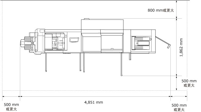 此外,如果安装分页装订处理器-AN1、鞍式分页装订处理器-AN2、折纸组件-J1、POD纸仓-D1、侧纸仓-C1 和 大容量堆叠器-H1,各设备之间需要留出 5 mm 的空间以便进行连接。