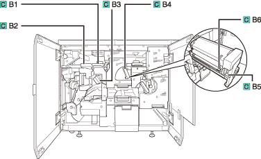 本节介绍如何清除辅助定影组件内发生的卡纸。下图指示主定影组件的位置。