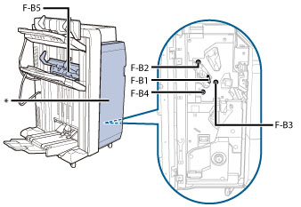 本节介绍如何清除“分页装订处理器-AN1”/“鞍式分页装订处理器-AN2”前盖板内发生的卡纸。下图指示“分页装订处理器-AN1”/“鞍式分页装订处理器-AN2”的位置。