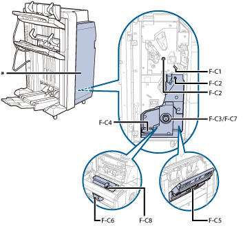 | 1. 打开鞍式装订处理器的右盖板 (F-C5)。 |