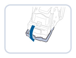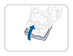 握住装订针箱的左右两侧,然后放下装订针箱的托架。