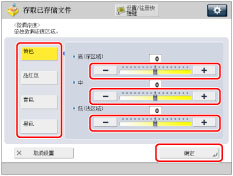 选择要调整的色彩 → 按 [-] 或 [+] 调整深(高)、中和浅(低)浓度区域的浓度等级 → 按 [确定]。