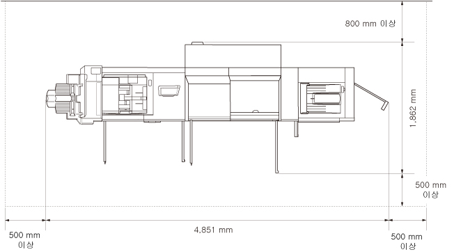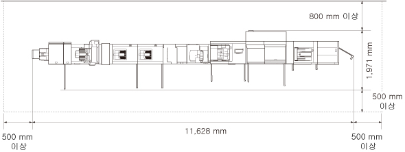 또한, Two-Knife Booklet Trimmer-A1, Booklet Trimmer-D1, Finisher-AN1, Saddle Finisher-AN2, Paper Folding Unit-J1, Perfect Binder-E1, Document Insertion Unit-N1, POD Deck-D1, Secondary POD Deck-D1, POD Deck Lite-C1, Multi Function Professional Puncher-A1 및 High Capacity Stacker-H1을 설치하려면, 각 기기의 연결을 위해 기기 사이에 5 mm의 공간이 필요합니다.