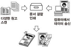 스캔하여 저장 기능을 사용하면 스캐너에서 스캔되었거나 컴퓨터에서 작성된 문서 데이터를 저장할 수 있습니다. 저장된 데이터를 지정된 시간에 인쇄하거나 동시에 처리할 수 있도록 개별적으로 저장된 데이터나 컴퓨터에 작성된 데이터와 결합할 수 있습니다.