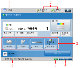 6. | 작업과 복사 조작의 진행 및 기기와 소모품 상태가 여기에 표시됩니다. 또한 부문 ID 관리가 설정된 경우, 기기에 로그인하는 데 사용되는 부문 ID가 표시됩니다. |