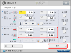<화상위치 조정> 화면에서 <배율 (f)> 및 <배율 (d)>의 확대/축소 배율(%)을 설정하고 → [확인]을 누릅니다.