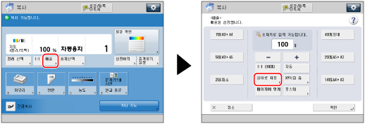 기기가 입력한 값에 따라 정확한 배율(줌)을 자동으로 계산합니다. 하지만 원고 이미지가 용지 크기에 따라 조금 잘릴 수도 있습니다.