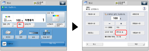 [자동 XY독립]을 설정한 경우, 수동 용지 선택 모드를 사용하여 용지 크기를 선택하세요. 용지 크기를 선택하지 않은 경우, 자동으로 본체의 오른쪽 용지 데크가 선택되고 해당 데크에 보급된 용지의 크기에 맞게 배율이 설정됩니다. |