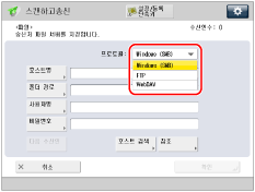 호스트명 | 호스트 이름은 네트워크에 서비스를 제공하는 호스트 컴퓨터에 지정된 이름입니다. 이 입력 박스에 발신 작업의 수신인으로 네트워크에 파일 서버 이름을 입력하십시오. 서버 프로토콜로 [FTP] 또는 [WebDAV]를 선택할 경우 포트 번호 다음에 콜론(:)을 입력하여 호스트 이름 주소 다음에 포트 번호를 지정할 수 있습니다. 예: 192.168.100.50:21000 IPv6 호스트를 전송할 때는 [호스트명]에 다음의 설정을 지정하십시오. [IPv6 주소]:<포트 번호> 예: [5aed:90a0:bc05:01d2:568a:2fc0:0001:12ee]:21000 문서를 전송 중인 FTP server 또는 WebDAV server에 지정된 것과 동일한 포트 번호를 호스트 이름에 입력하였는지 확인하십시오. |
