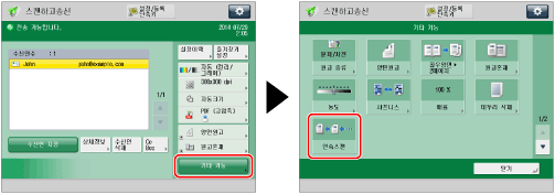 연속 스캔 모드 중에 [설정변경]에 나타나는 설정만 변경할 수 있습니다. 먼저 필요한 스캔 설정을 지정해야 합니다. 원고를 피더에 세트한 경우에는 각 원고 묶음의 스캔이 완료되었을 때 원고 배지 트레이의 원고를 제거하십시오. 한 번에 송신할 수 있는 최대 페이지 수는 999페이지입니다. [연속스캔]을 사용할 때 999페이지의 원고를 스캔하면 작업을 송신할지를 확인하는 메시지가 나타납니다. 작업을 송신하도록 선택하면 스캔된 999페이지가 송신됩니다. 작업을 취소한 경우 스캔한 페이지가 송신되지 않습니다. |
