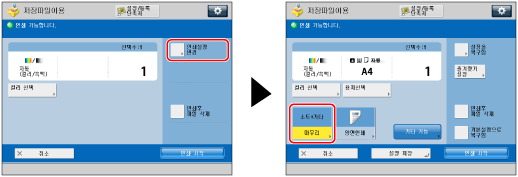 다음 경우에만 [90도 회전]을 설정할 수 있습니다. 용지 크기 선택 화면에서 용지 크기가 [자동]으로 설정된 경우 90도 회전과 호환되는 용지 크기가 가로 및 세로 방향으로 모두 적재된 경우 선택된 용지 공급원의 [용지 카세트 자동선택 설정/해제]가 '설정'으로 지정된 경우 ("용지 카세트 자동 선택 사용" 참고) 회전할 수 있는 용지가 없는 경우 출력물은 소트됩니다. |