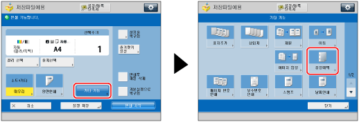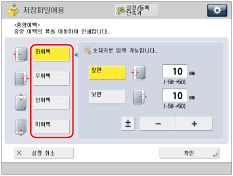 [앞면] 또는 [뒷면]을 누르고 → 중앙 여백 폭을 설정하기 위해 [-] 또는 [+]를 누르고 → [확인]을 누릅니다.