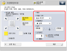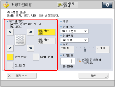 <부수인쇄 옵션>을 [부수번호 인쇄 옵션 설정]에서 '해제'로 설정한 경우, [전면 인자] 및 [5곳에 인쇄]가 회색으로 처리되고 선택할 수 없습니다. ("부수 번호 인쇄 옵션" 참고) [페이지 번호 인쇄], [스탬프] 또는 [날짜인쇄] 중 두 가지를 설정하여 동일한 위치에서 인쇄한 경우, 를 누르면 확인 메시지가 나타납니다. |