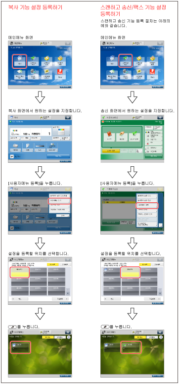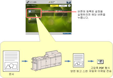 기본 설정은 위의 '설정 내용'에 나열된 설정을 제외한 모든 [복사] 기능 설정에 사용됩니다. 내 버튼/공유 버튼 등록에 대한 자세한 내용은 "내 버튼/공유 버튼 등록"에서 예로 나온 스캔하고 송신 기능 사용 설명을 참고하십시오. 복사, 스캔하고 송신 및 스캔하고 저장 기능을 사용하는 데 필요한 선택 품목 제품에 대한 자세한 내용은 "각 기능에 필요한 선택 품목 제품" 을 참고하십시오. |