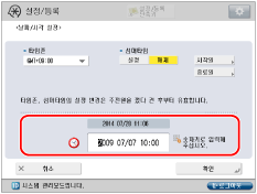 [환경 설정] → [타이머/전력 설정] → [날짜/시각 설정]을 누릅니다.