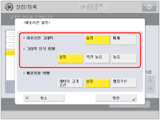 <그래픽 인식 레벨>이 증가하면 데이터 크기가 증가합니다. 기본적으로 [보통]을 먼저 사용하고, 원하는 결과물을 얻지 못할 경우에는 인식 레벨을 [약간 높음] 또는 [높음]으로 높여 보십시오. |