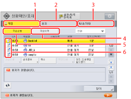 1 | 작업 종류 드롭다운 리스트 작업 종류별로 표시된 작업을 정렬할 때 누릅니다. 다음의 작업 종류를 선택합니다. 인쇄 복사 송신 전송 |