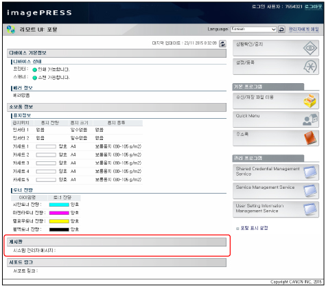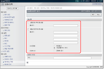 메시지: | 터치 패널 화면 또는 리모트 UI의 포털 페이지에 표시된 메시지를 팝업창으로 입력하십시오. 한 줄에 최대 23자까지 입력할 수 있으며 메시지 입력에 네 줄을 이용할 수 있습니다. |