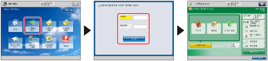 "기동/복구후 표시화면"에 명시된 화면이 구동/복원 후 표시되는 기본 화면으로 표시됩니다. 사용이 제한된 기능을 선택하면 로그인 화면이 표시됩니다. 부문 ID와 PIN 번호를 입력하여 각각의 기능을 사용합니다.