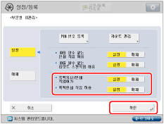 부문 ID 및 PIN을 입력하는 화면에 [흑백 복사/인쇄]를 표시하지 않으려면 <흑백복사/인쇄 작업허가>을 '해제'로 설정합니다.