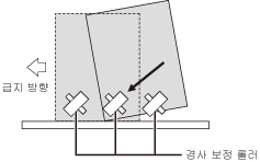 기울기 보정 롤러는 마킹 엔진의 급지 유니트에 있습니다. 이 롤러는 급지 유니트 내부의 벽에 용지를 대각선으로 밀어넣어서, 급지된 용지의 등록된 위치를 조정합니다. 기울기 보정 레벨이 잘못 설정되면, 인쇄된 이미지가 기울어집니다.
