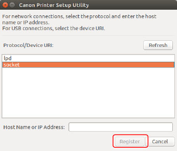 Select the protocol or device URI, depending on how the printer is connected → click [Register].