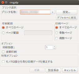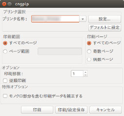 各種デフォルトの印刷属性設定を行うだけのオプションであるため、UI上は[設定保存]および[キャンセル]ボタンのみの使用となります。[印刷]ボタンはグレーアウトしています。 |